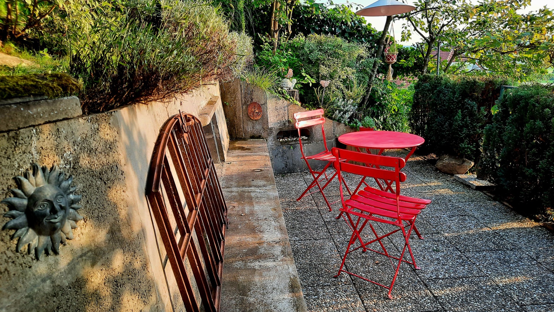 K dispozici přední rovná i zadní terasovitá zahrada s mnoha pěknými posezeními a zákoutími.